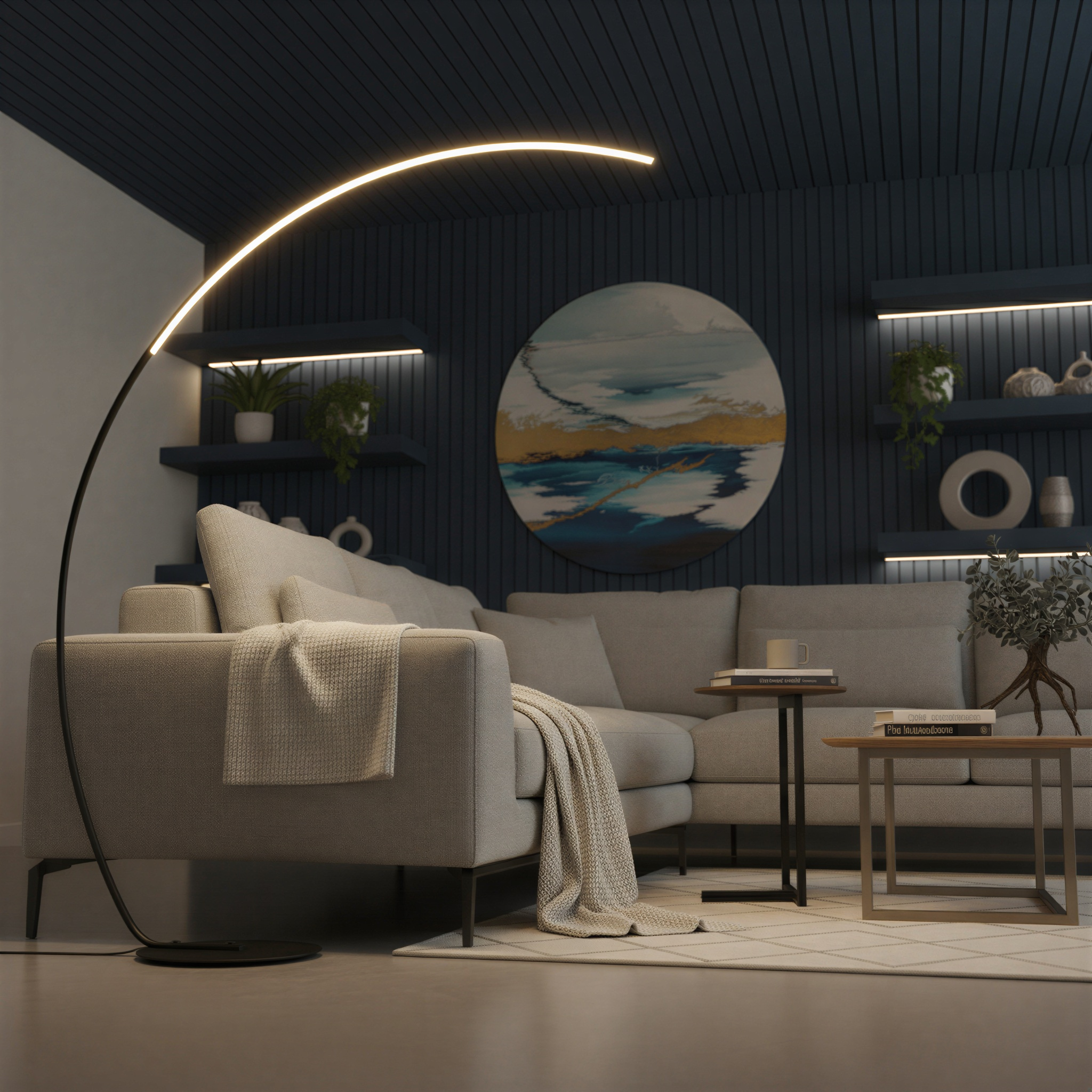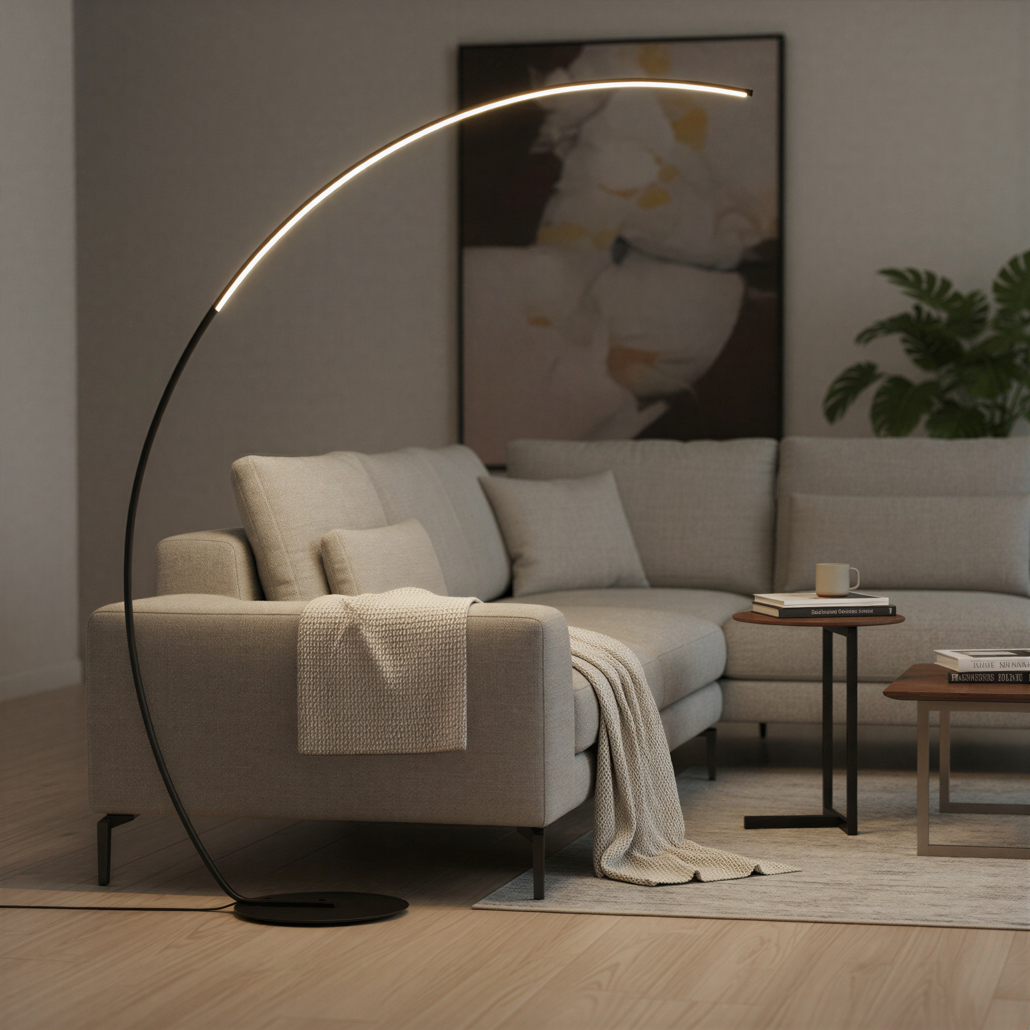 Ce lampadaire en demi-lune est un luminaire d'intérieur sur pied. Il se compose d'une base circulaire et d'une grande structure en arc de cercle. L'éclairage est directement diffusé par une bande LED intégrée qui épouse la courbe supérieure de l'appareil.